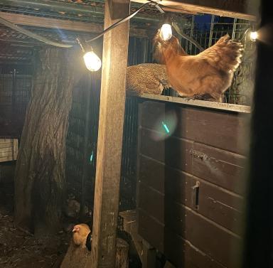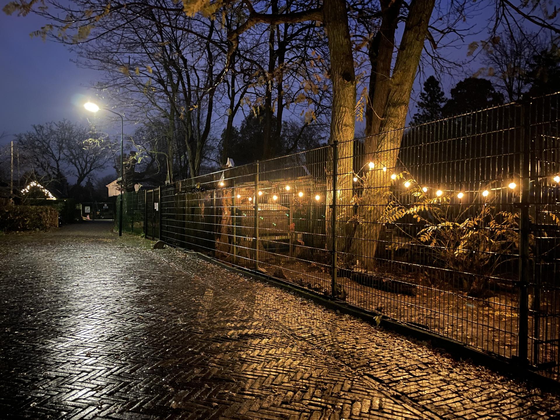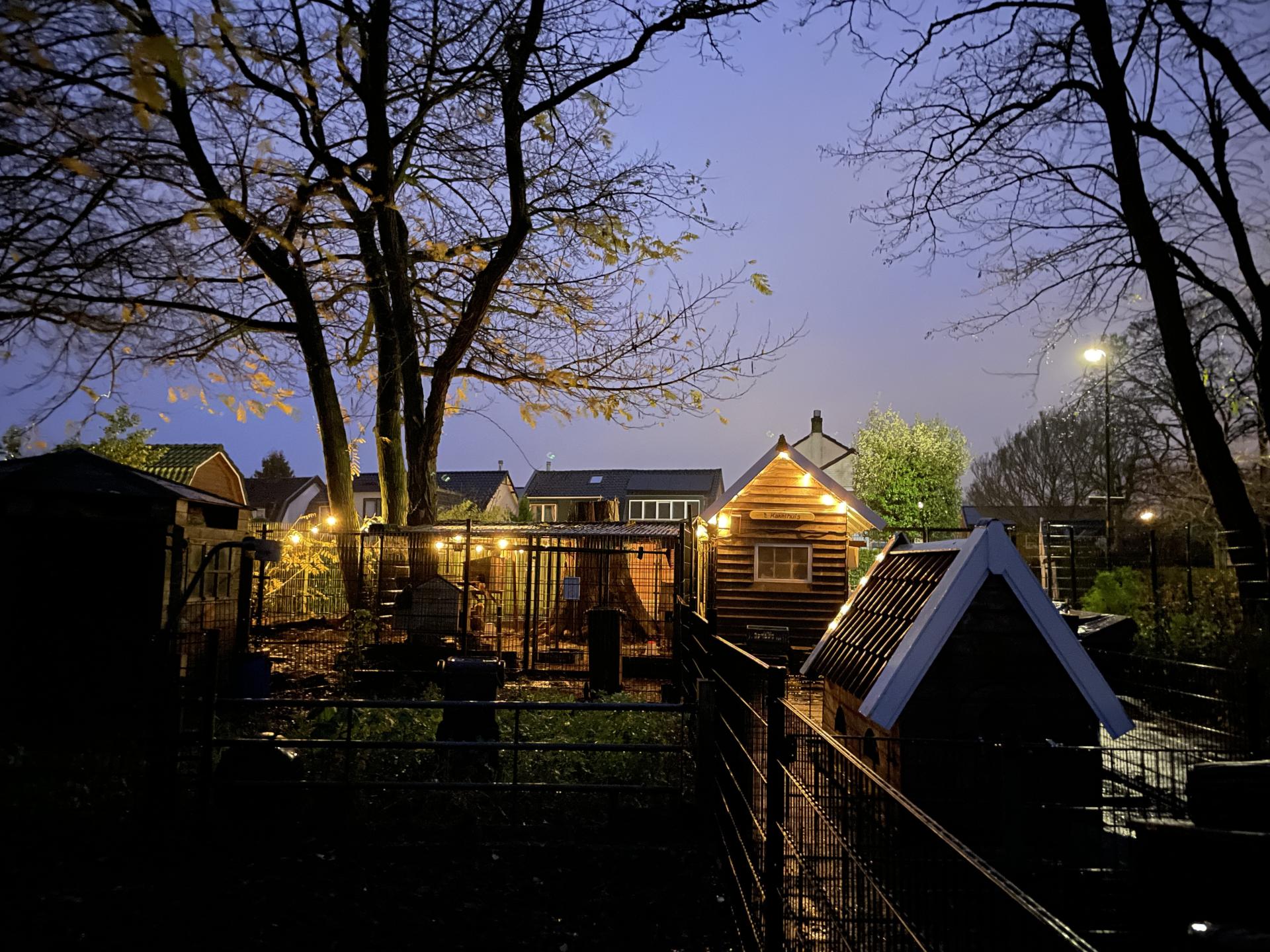 Zondag 7 december hebben we, de vrijwilligers van de kinderboerderij, de lichtjes aangestoken. Het Kakelhuis is nu mooi verlicht, net zoals het straatje, heel sfeervol. De kippen moesten even wennen, maar hebben het nu prima naar hun zin. Sommige gingen heerlijk binnen op stok, andere liepen nog fijn even buiten. Gelukkig ging het pas regenen toen het laatste snoer met lampjes hing.